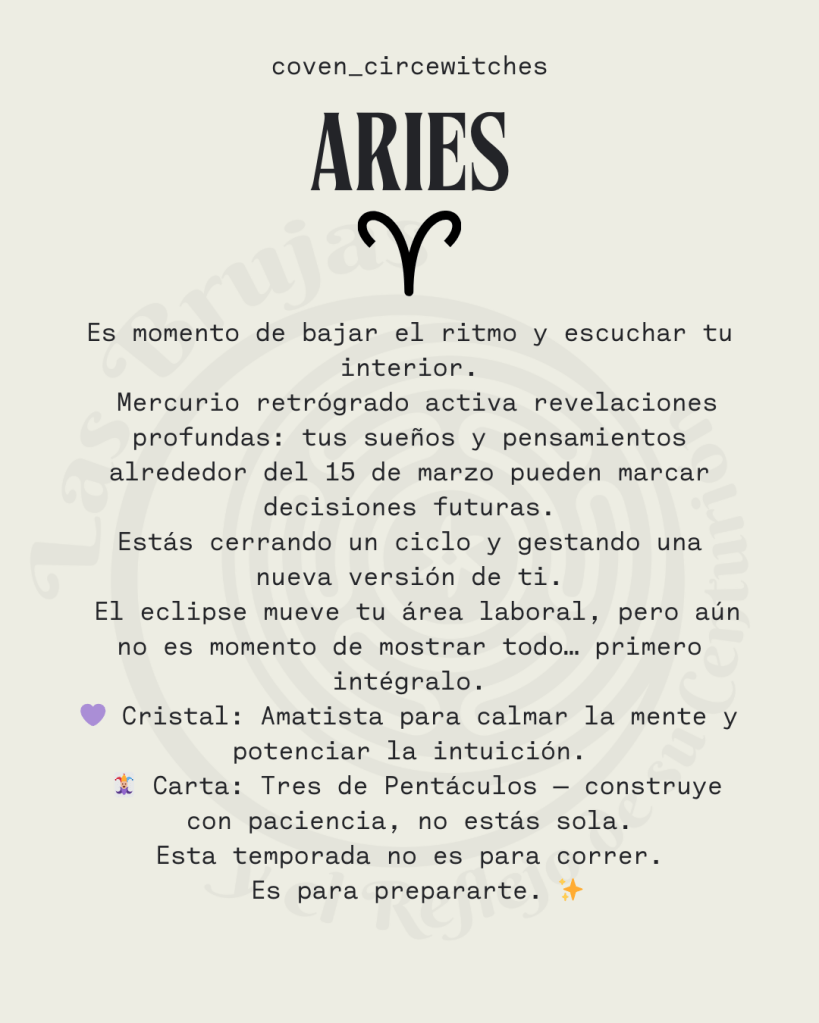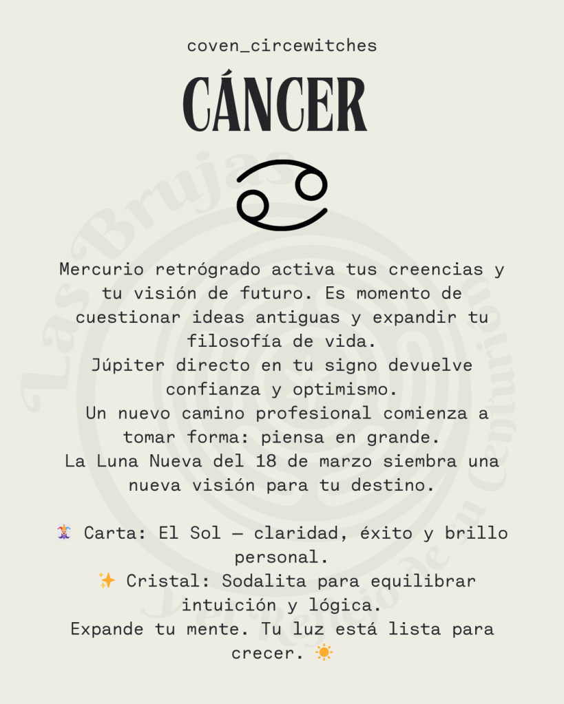 Con Venus ingresando también en Aries el 6 de marzo, comienzas a recibir mayor claridad sobre los cambios que se están gestando, especialmente en temas de hogar, familia y estabilidad emocional. Podrían presentarse ajustes importantes en tu entorno cercano, por lo que la flexibilidad será clave.