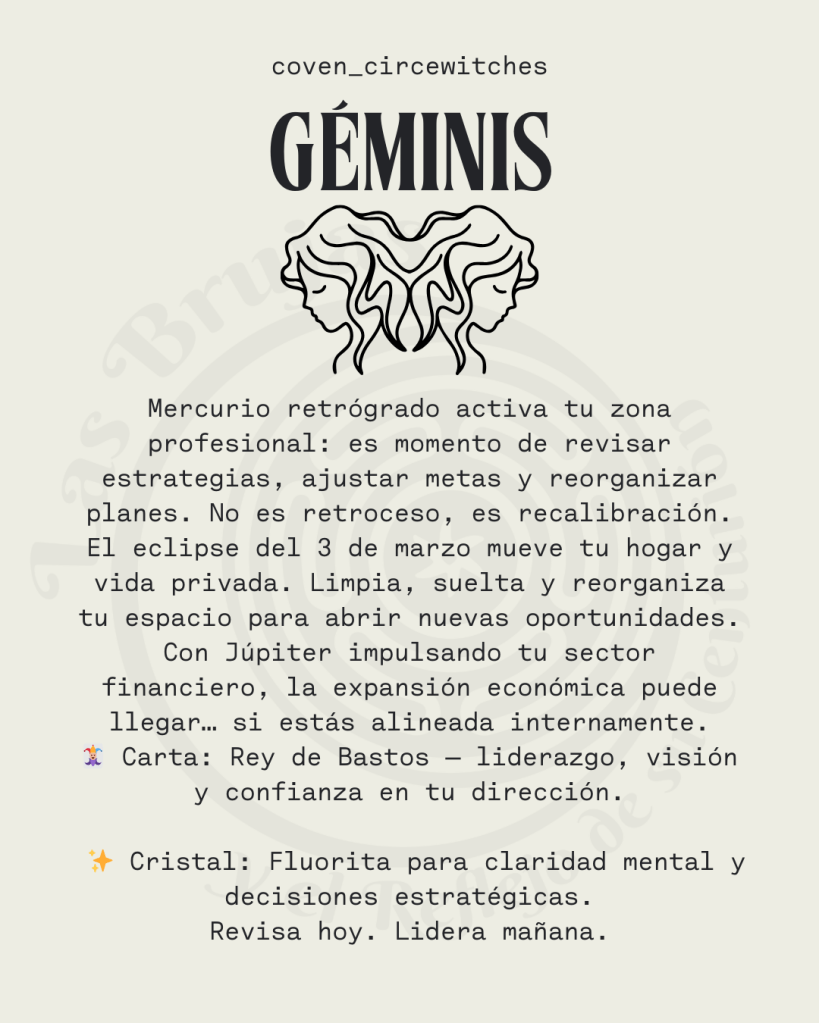 En paralelo, Mercurio retrógrado entre el 25 de febrero y el 20 de marzo activa tu tercera casa: comunicación, acuerdos, estudios y entorno inmediato. Este tránsito puede traer malentendidos o retrasos, pero también te ofrece la oportunidad de replantear tu manera de expresar ideas y posicionarte.