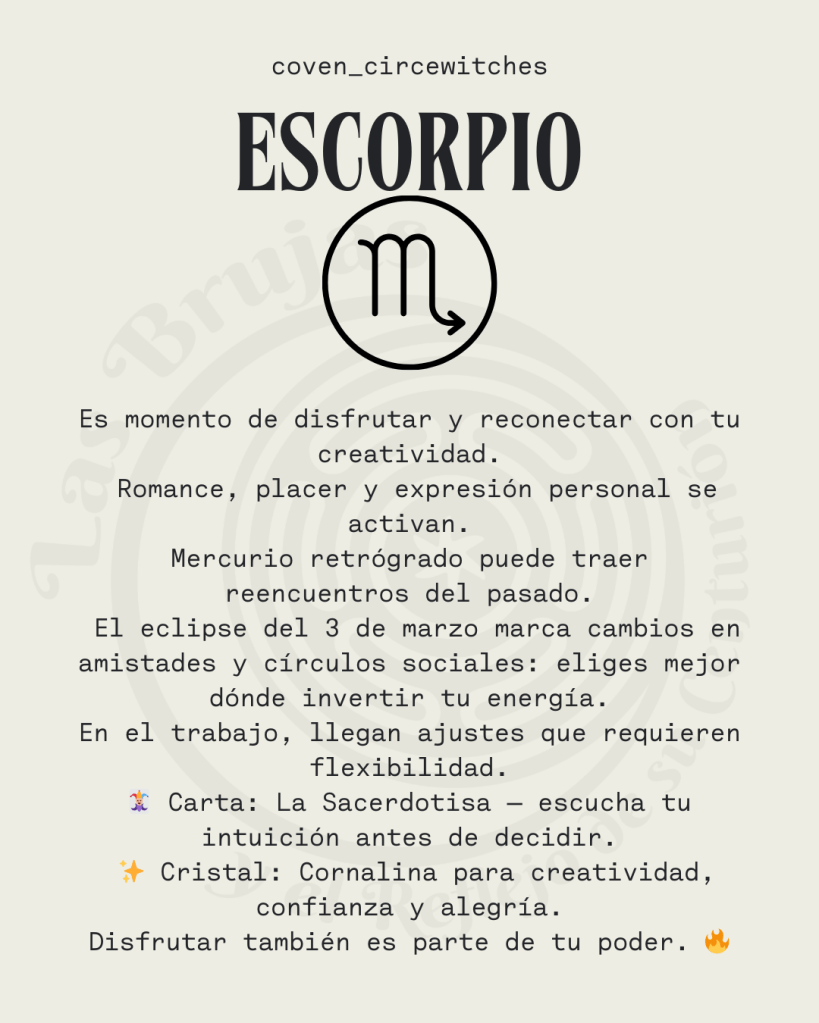 Si existen deudas o proyectos financieros pendientes, este es el momento perfecto para diseñar un plan estratégico. El eclipse de Luna Llena en Virgo del 3 de marzo refuerza esta temática, invitándote a observar no solo lo material, sino también el intercambio energético en tus relaciones y acuerdos. La paciencia será clave: muchas piezas comenzarán a encajar cuando Mercurio retome su movimiento directo el 28 de marzo.