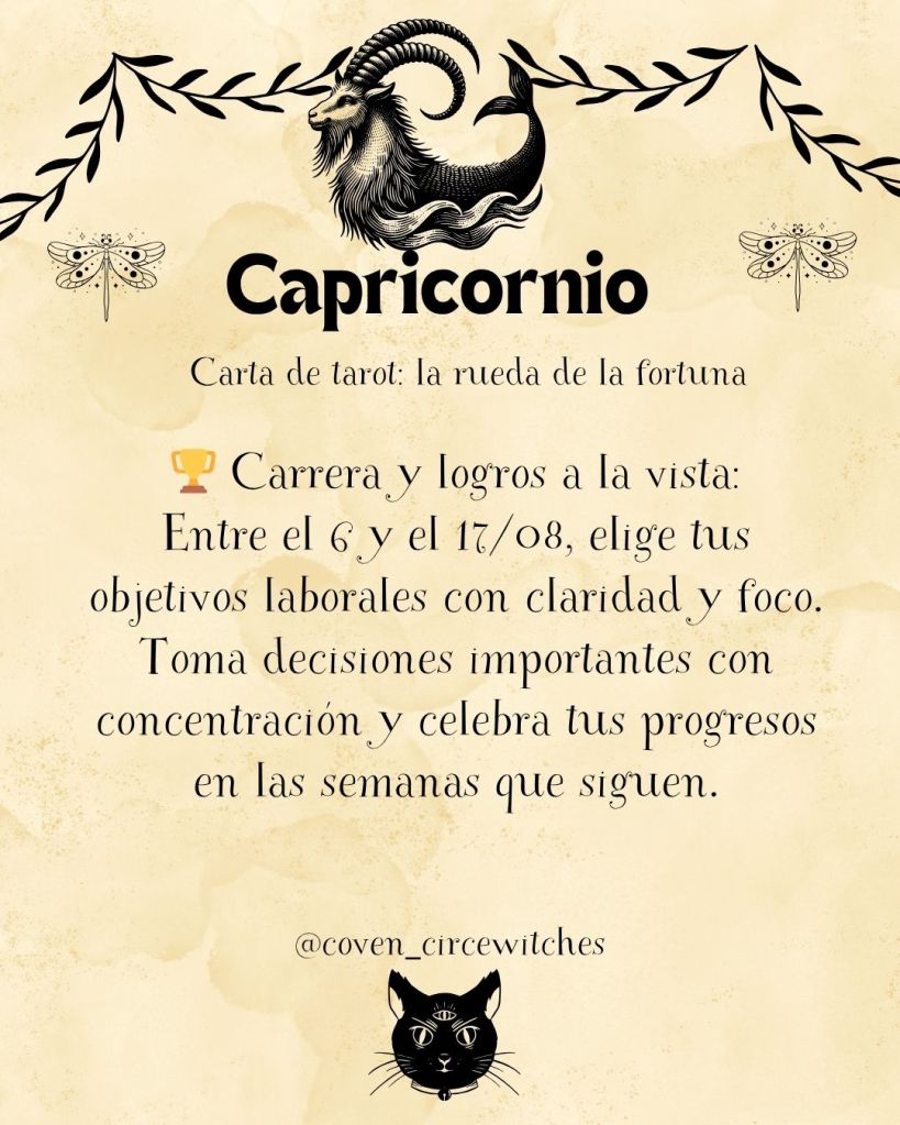 Capricornio, este periodo resalta tu ambición y tu potencial para avanzar profesionalmente. Entre el 6 de agosto y el 21 de septiembre, el ingreso de Marte en Libra activa tu sector de metas y proyectos. Durante las dos primeras semanas (del 6 al 17 de agosto), será esencial que tomes decisiones con claridad y foco para evitar malentendidos: la energía estará intensa, pero si mantienes la concentración, muy pronto gozarás de unas de las semanas más productivas del año.