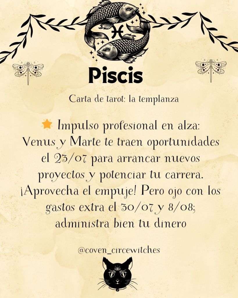 Piscis, esta temporada te recibe con un impulso renovado en tu carrera. Venus y Marte unen fuerzas alrededor del 23 de julio, trayendo oportunidades para nuevos proyectos, ascensos o la llegada de colaboradores que pueden marcar la diferencia en tu camino profesional. Aprovecha esta energía para mostrar tu creatividad y liderazgo, pero mantente alerta: la tentación de gastar de más será fuerte, especialmente cerca del 30 de julio y el 8 de agosto. Administra tus recursos con sabiduría y prioriza lo esencial.