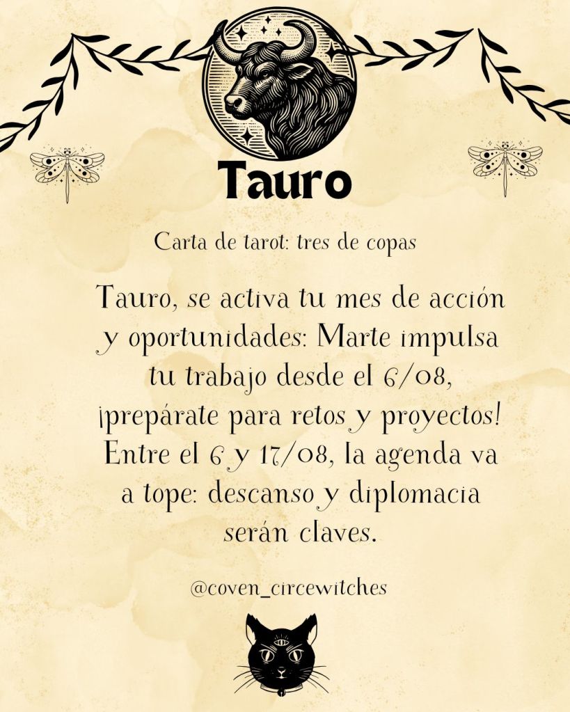 ¡Tauro, prepárate para un mes lleno de movimiento y oportunidades! Marte dinamiza tu sector profesional a partir del 6 de agosto, trayendo proyectos importantes y retos laborales que exigirán lo mejor de ti durante las próximas seis semanas. Entre el 6 y el 17 de agosto, tu agenda podría saturarse, así que prioriza el descanso y mantén la energía en equilibrio para responder a todas tus responsabilidades.