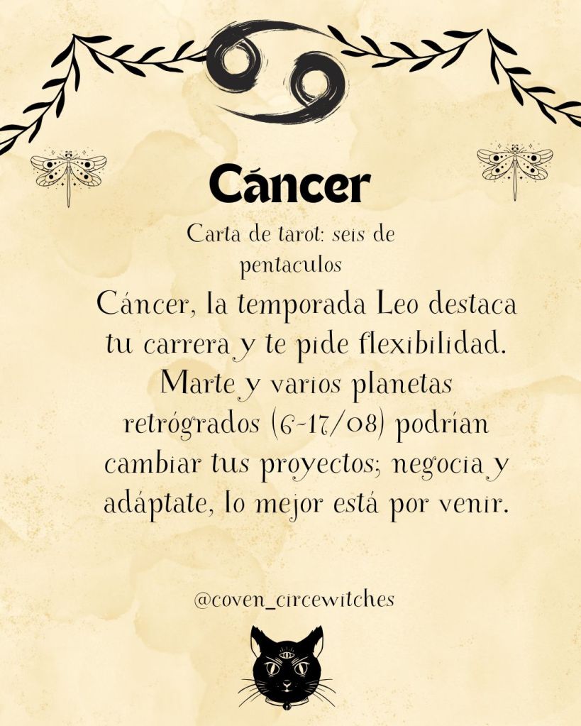 Durante la temporada de Leo, tu carrera cobra protagonismo, Cáncer. El tránsito de Marte en Libra, activando a Saturno y Neptuno retrógrados entre el 6 y el 17 de agosto, puede empujarte a reconsiderar profundamente algunos proyectos profesionales. Será importante mostrar tu lado más diplomático, ya que estas semanas invitan a revisar, negociar y adaptarte a nuevas circunstancias en el trabajo. Permítete ser flexible: si un proyecto se transforma o incluso se disuelve, será para abrirte a oportunidades más alineadas con tu propósito.