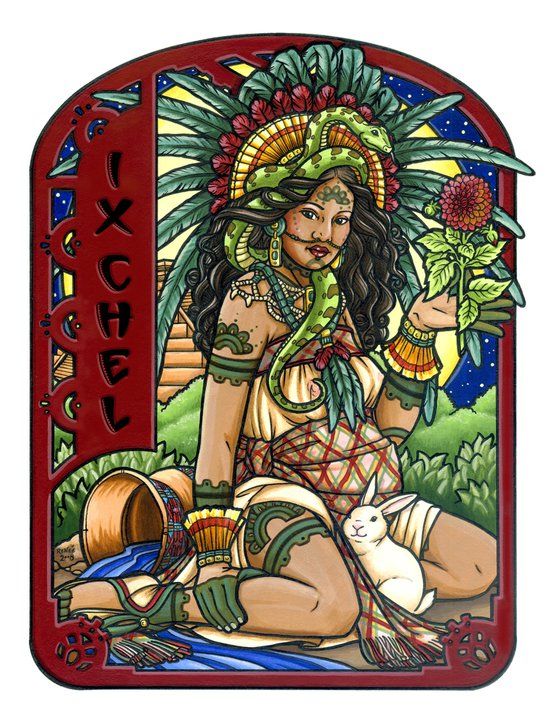 Ixchel es la diosa jaguar de los mayas . Es la diosa del amor y el sexo, la curación y la gestación. Su marido era Ak Kin, el dios del sol. El significado de su nombre, “Ix Chel” es arcoíris grande o mujer arcoíris.
