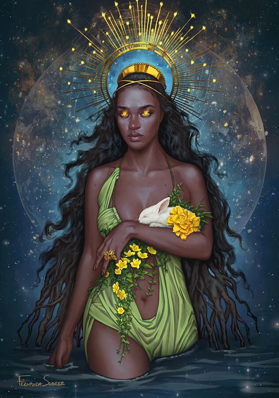 Yemayá (también conocido como Yemọja o Yemanjá) es un espíritu de río yoruba. Ella es una Orisha , un espíritu guía de los ríos enviado para ayudar a la humanidad. Cuando el pueblo yoruba fue esclavizado por los colonizadores, Yemayá también se fusionó con la Virgen María en prácticas sincréticas. en América, los orishas son las deidades de religiones sincretizadas como la santería, la umbanda y el candomblé.