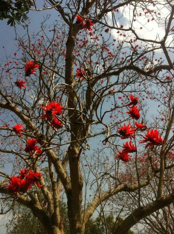 🔴El colorín mide de 3 a 10m de altura, sus ramas son espinosas y de color verde pálido con grupos de flores rojas como arillos. Las flores tienen racimos piramidales rojas llamativas. Son fácilmente reconocibles porque todos hemos visto uno en la ciudad.